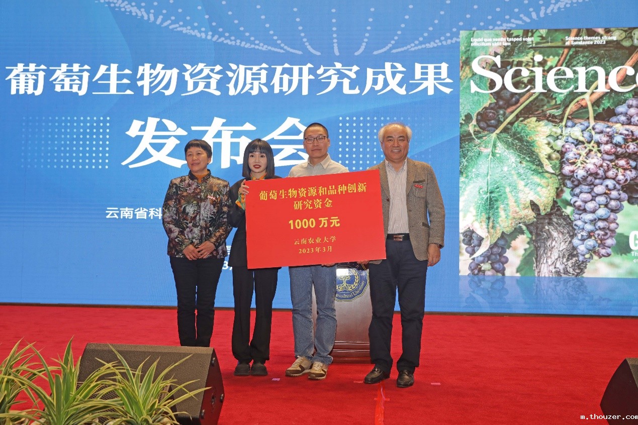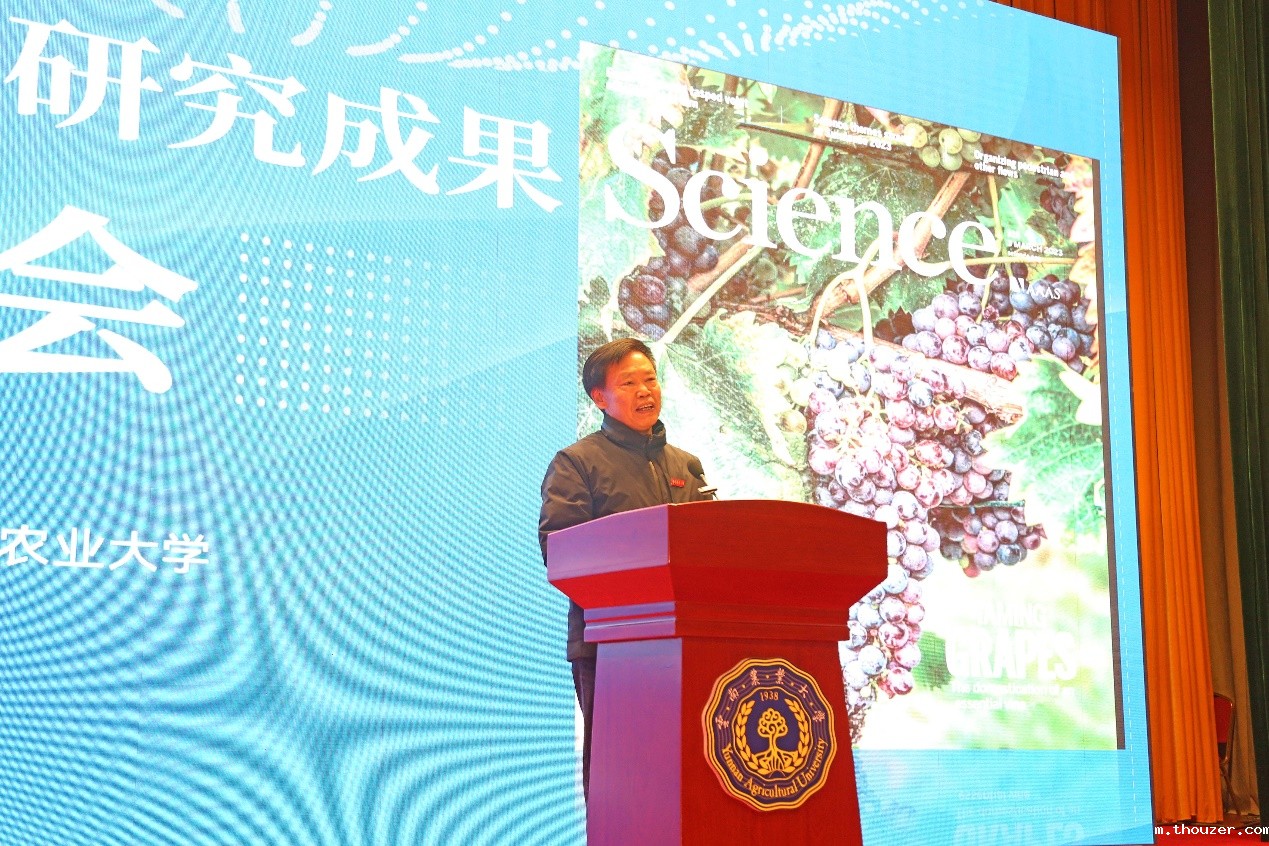 省科技厅厅长王学勤主持会议并作研究成果发布。省教育厅副厅长王永全到会并讲话。校长李永和致辞,董扬教授代表团队作研究成果报告,盛军教授、朱怡凡博士回顾和展望葡萄资源研究历程,介绍相关成果转化创新研究情况,朱有勇院士作了专家点评,学校党委书记黎素梅向董扬教授团队授予“葡萄生物资源和品种创新研究资金”。