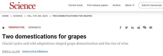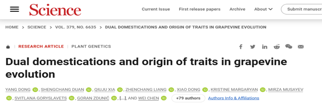 本站消息 2023年3月2日,我校董扬教授团队关于葡萄全球生物资源研究成果,以Dual domestications and origin of traits in grapevine evolution为题,作为国际顶级学术期刊《Science》当期封面文章发表,并受邀参加2023年3月Science期刊年会推荐论文。